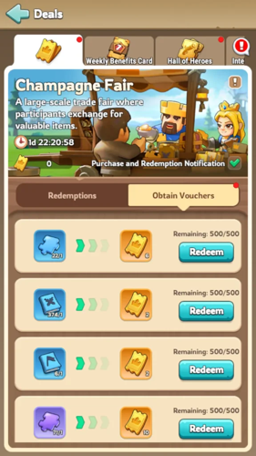 To start, navigate to the "Obtain Vouchers" section to exchange your surplus hero shards and skill books for fair vouchers.