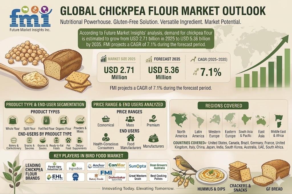 NEWARK, Del., USA | April 8, 2026 — According to the latest market analysis by Future Market Insights, the global chickpea flour market is witnessing steady expansion, driven by rising demand for plant-based protein, gluten-free alternatives, and clean-label food ingredients. The market is projected to grow from USD 2.71 billion in 2025 to USD 5.36 billion by 2035, registering a CAGR of 7.1% during the forecast period.