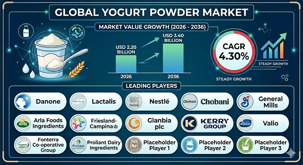 NEWARK, Del., USA | April 9, 2026 — According to the latest market analysis by Future Market Insights, the global yogurt powder market is set for steady growth, driven by increasing demand for shelf-stable dairy ingredients, functional nutrition, and clean-label formulations. The market is projected to grow from USD 2.20 billion in 2026 to USD 3.40 billion by 2036, registering a CAGR of 4.3% during the forecast period.