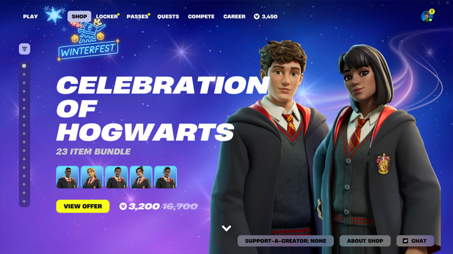 Hãy cân nhắc Gói Celebration of Hogwarts với giá 3,200 V-Bucks để có giá trị tốt hơn, vì nó bao gồm hầu hết các vật phẩm trừ gói xe và bánh xe.