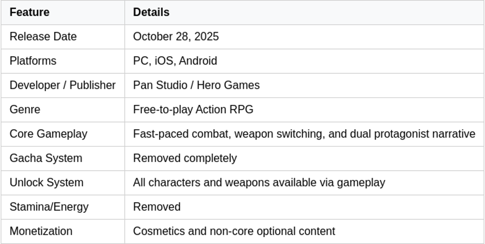 The developers intentionally removed gacha elements such as drop rates and banners, opting instead for transparent and skill-based progression.