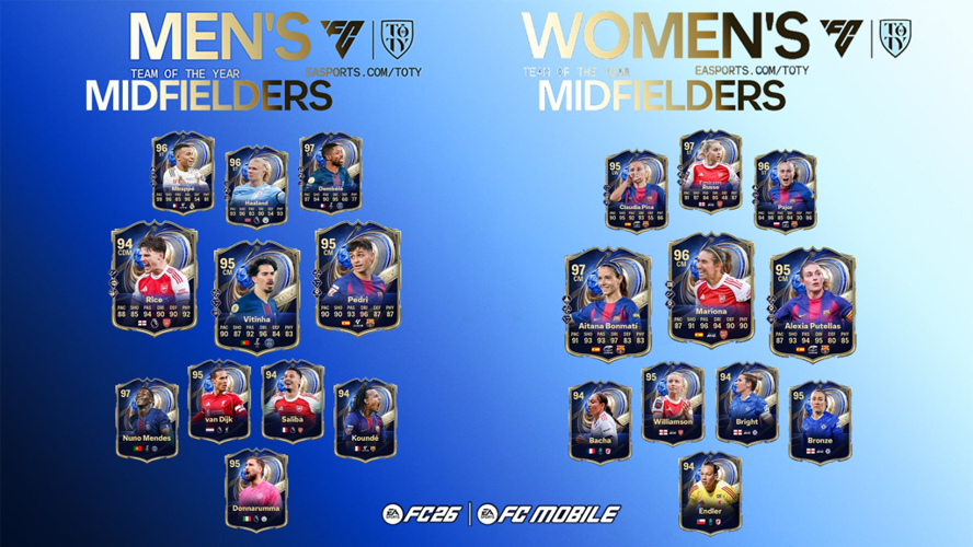 Das Team of the Year in FC 26 umfasst sowohl männliche als auch weibliche Top-Spieler, die durch eine Abstimmung gewählt wurden. Während die genauen Statistiken der Stimmen noch nicht veröffentlicht wurden, ist bekannt, dass Lucy Bronze vom FC Chelsea und Kylian Mbappé vom Real Madrid zu den Kapitänen gewählt wurden. Das Team wird in mehreren Phasen veröffentlicht, beginnend mit den Stürmern, gefolgt von den Mittelfeldspielern, Verteidigern und Torhütern, bevor alle Spieler in den Packs verfügbar sind.